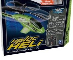 The Havoc Heli has twin rotors for stability and four-way control for flying in any direction with accuracy -- up, down, under, over, left, right, forward and backward. Like a real helicopter, the Havoc can hover in one spot. It even manuevers through the toughest of obstacles. Intended for indoor use, the helicopter operates outdoors with zero wind conditions, and can fly up to 100 feet high in the air. The Havoc Heli is also equipped with a flashing blue LED light for night flying.